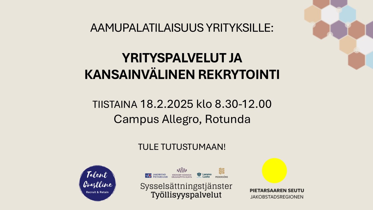 - 18.2.2025 klo 8.30-12 Aamupalatilaisuus Pietarsaaren seudun yrityksille: Yrityspalvelut ja kansainvälinen rekrytointi