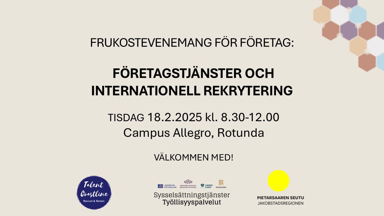 - 18.2.2025 kl. 8.30-12 Frukostevenemang för företag i Jakobstadsregionen: Företagstjänster och internationella rekryteringar