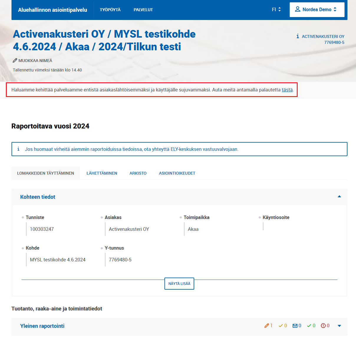 En kundnöjdhetsenkät har genomförts för verksamhetsutövarna i Regionförvaltningens e-tjänst i samband med uträttandet av ärenden i YLVA. Enkäten genomfördes som ett fast element i övre delen av sidan och det är möjligt att besvara den i vilket skede som helst i samband med att man uträttar ärenden. En bild av enkätens placering i Regionförvaltningens e-tjänst finns nedan.