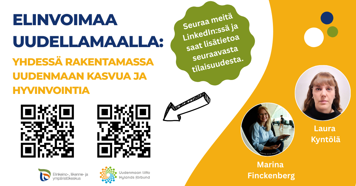 Elinvoimaa Uudellamaalla -tilaisuudet kokoavat yhteen Uudenmaan elinkeino-, työllisyys- ja kotoutumistoimijat ajankohtaisten teemojen äärelle. Virtuaalisessa kohtaamispaikassa jaetaan uusinta tietoa, käsitellään alueen kehitysnäkymiä ja vahvistetaan yhteistyötä monimuotoisen ja kestävän kasvun edistämiseksi.