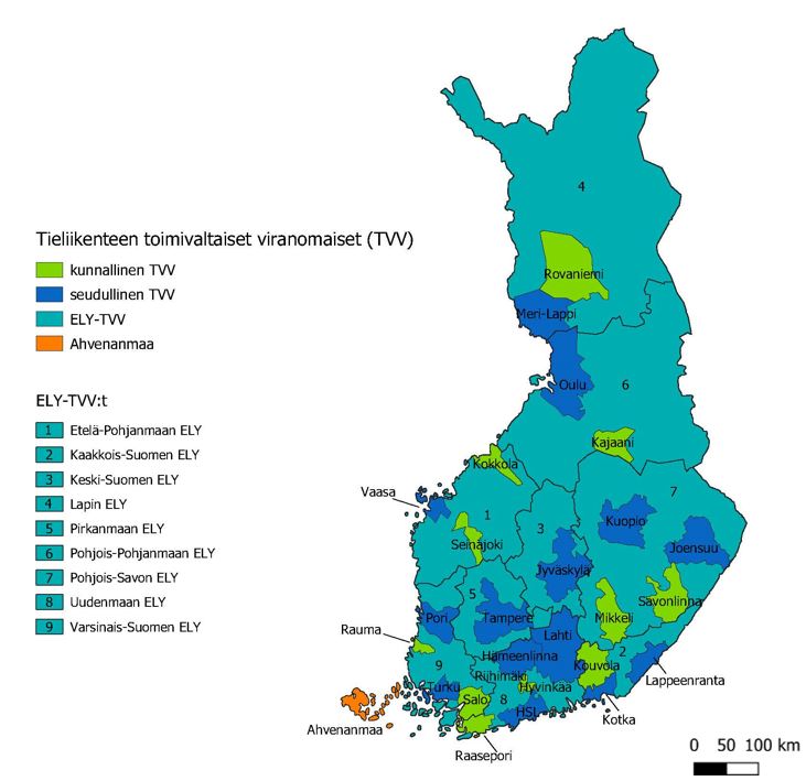 Suomen kartta, johon merkitty alueittain tieliikenteen toimivaltaiset viranomaiset (TVV)