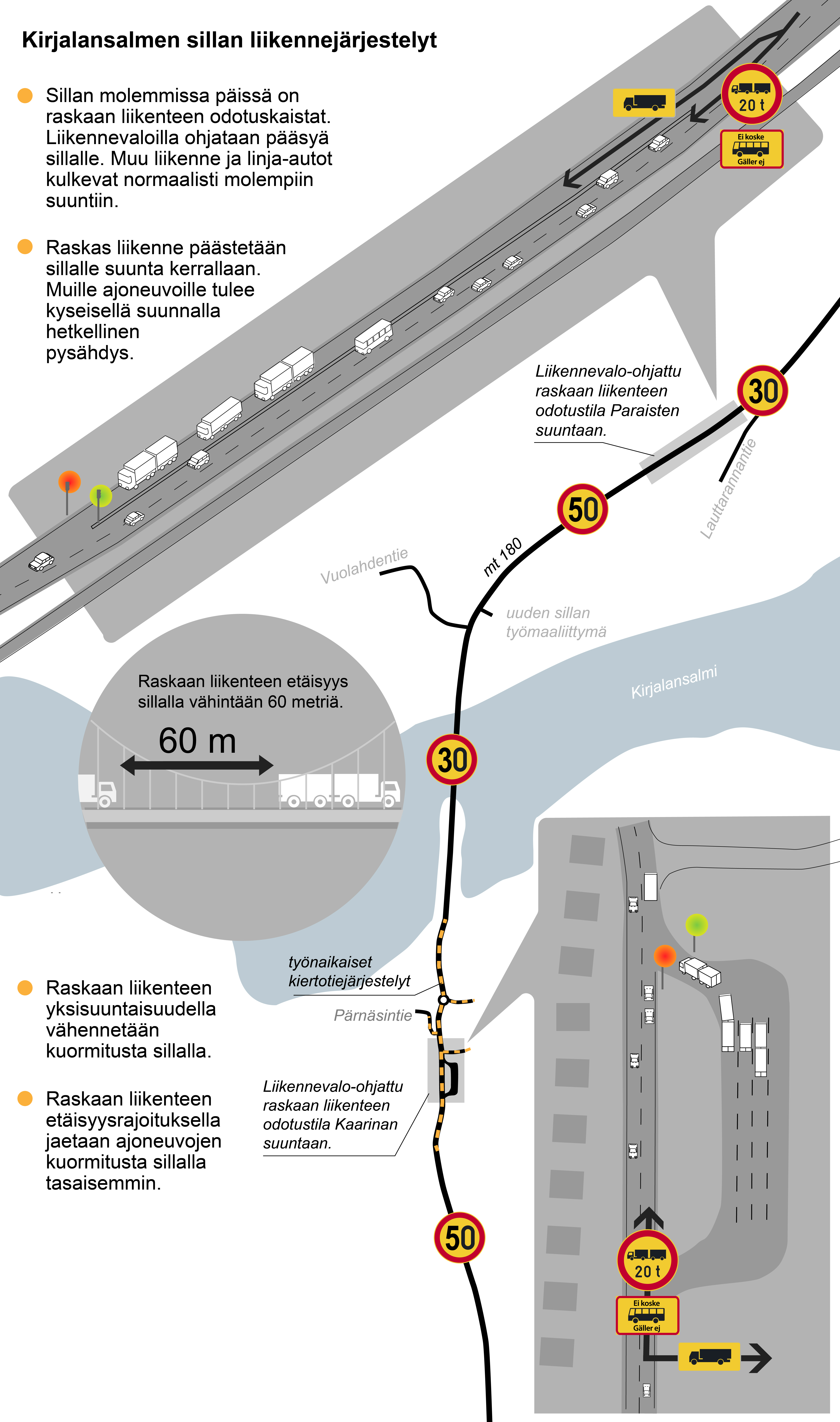 Sillalla säilyy edelleen myös raskaan liikenteen 60 m etäisyys. Tämän noudattaminen on äärimmäisen tärkeää, sillä liikennejärjestelyjen tavoitteena on jakaa kuormitusta sillalla tasaisemmin.