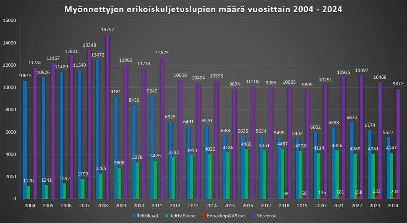 Erikoiskuljetuslupia myönnetään vuosittain 10 000–14 000 kpl. Ahvenanmaata lukuun ottamatta kaikki erikoiskuljetusluvat myöntää Pirkanmaan ELY-keskus. Lupamäärät seurailevat pitkälti talouden suhdanteita.