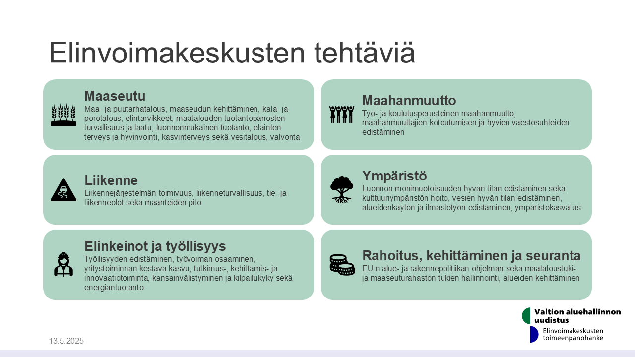 Elinvoimakeskusten tehtäviä  Maaseutu  Maa- ja puutarhatalous, maaseudun kehittäminen, kala- ja porotalous, elintarvikkeet, maatalouden tuotantopanosten turvallisuus ja laatu, luonnonmukainen tuotanto, eläinten terveys ja hyvinvointi, kasvinterveys, valvonta  Liikenne  Liikennejärjestelmän toimivuus, liikenneturvallisuus, tie- ja liikenneolot sekä maanteiden pito  Elinkeinot ja työllisyys  Työllisyyden edistäminen, työvoiman osaaminen, yritystoiminnan kestävä kasvu, tutkimus-, kehittämis- ja innovaatiotoiminta, kansainvälistyminen ja kilpailukyky sekä energiantuotanto  Maahanmuutto  Työ- ja koulutusperusteinen maahanmuutto, maahanmuuttajien kotoutumisen ja hyvien väestösuhteiden edistäminen  Luonnonvarat ja ympäristö  Luonnon monimuotoisuuden hyvän tilan edistäminen sekä kulttuuri-ympäristön hoito, vesien hyvän tilan edistäminen, alueidenkäytön ja ilmastotyön edistäminen, ympäristökasvatus, luonnonvarojen käyttö, vesitalous, patoturvallisuus  Rahoitus, kehittäminen ja seuranta  Yritys- ja hankerahoitus, EU:n alue- ja rakennepolitiikan ohjelman sekä maataloustuki- ja maaseuturahaston tukien hallinnointi, alueiden kehittäminen.