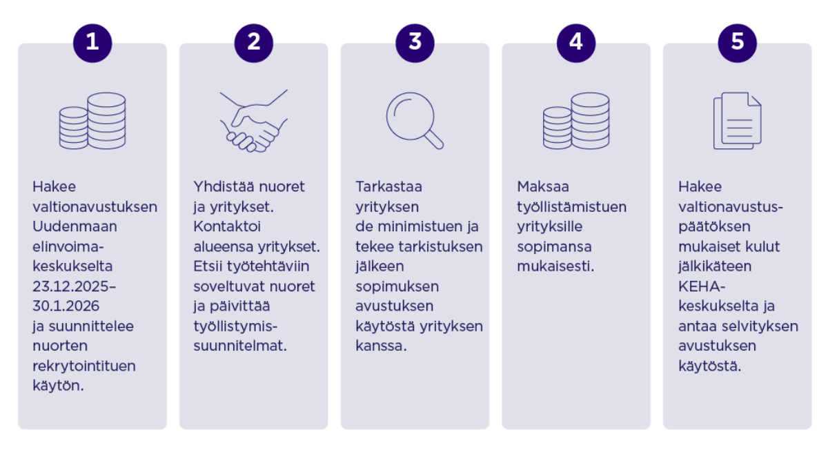 Uudenmaan elinvoimakeskus myöntää työvoimaviranomaisille valtionavustusta nuorten työllistämisen tukemiseen. Työ- ja elinkeinoministeriö kohdistaa nuorten työllistymiseen 30 miljoonaa euroa vuosina 2026–2027. Niin sanotulla nuorten työllistymissetelillä avataan nuorille ovia työelämään ja ehkäistään nuorten työttömyyden pitkittymistä.