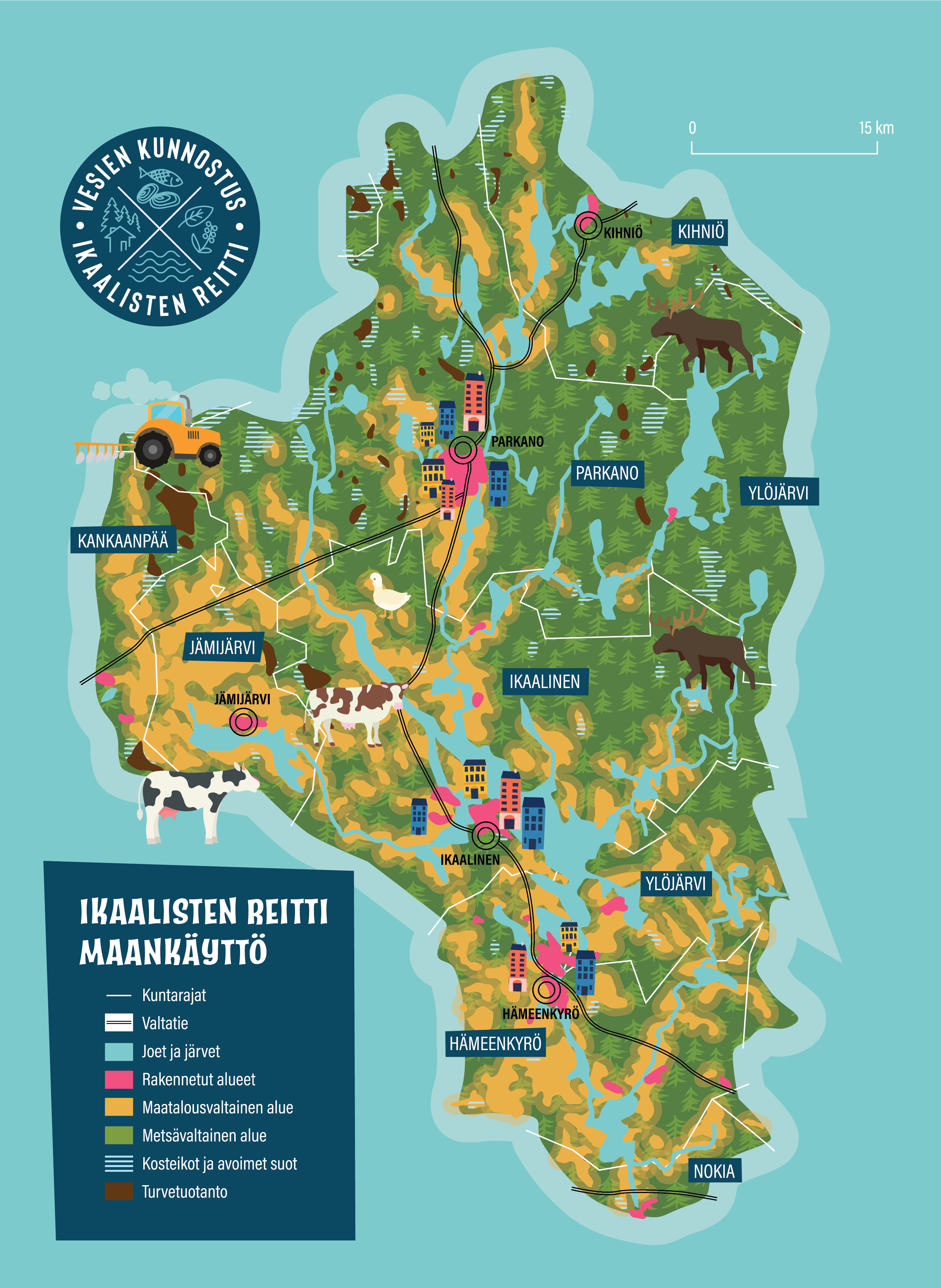 Alla olevassa kartassa on kuvattu Ikaalisten reitin vesistöalueen maankäyttöä. Klikkaa kuvaa saadaksesi sen suuremmaksi.