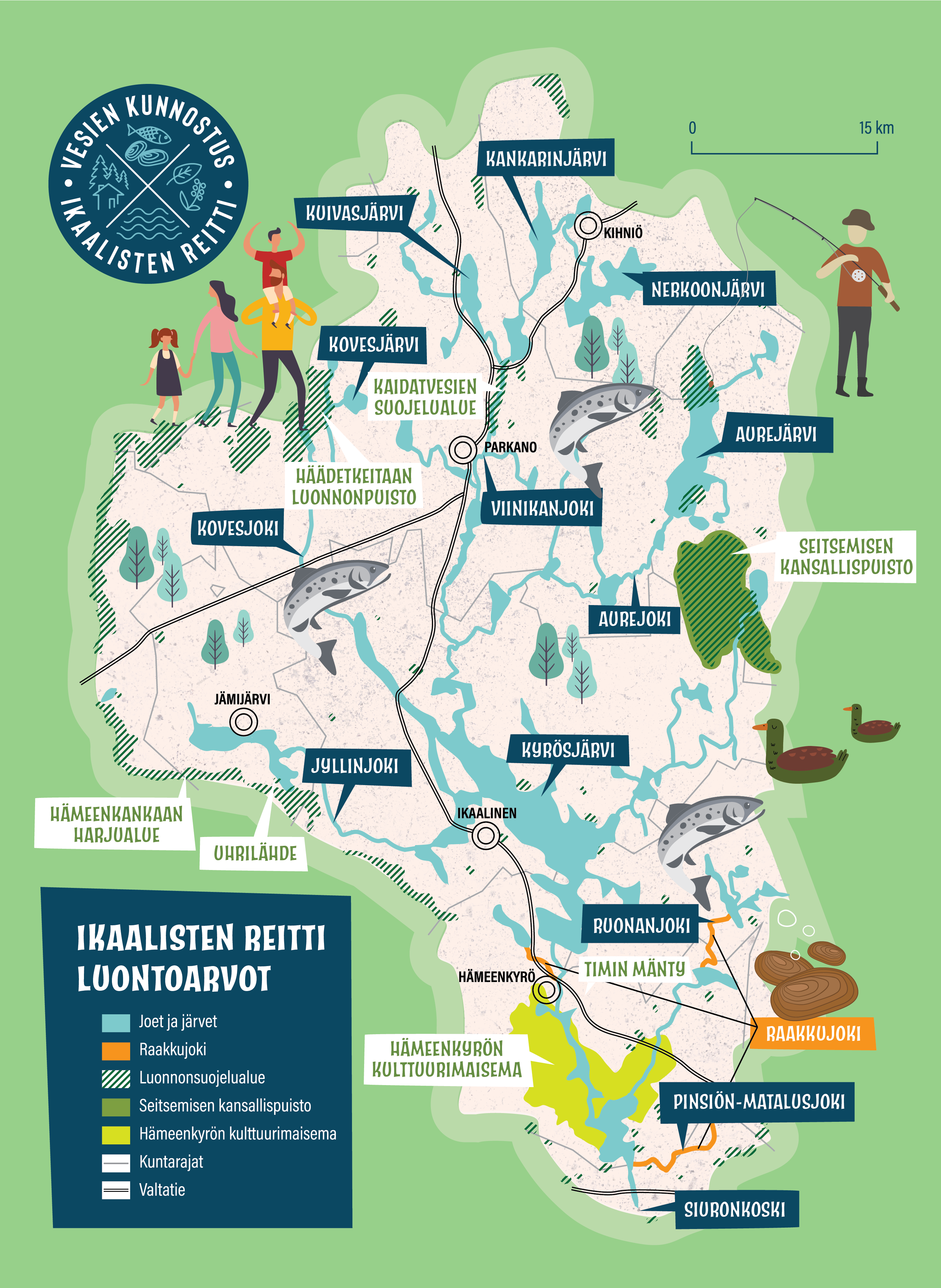 Raakku eli jokihelmisimpukka on laji, jonka elää kirkkaissa ja virtaavissa vesissä. Raakku voi elää jopa yli 120-vuotiaaksi. Raakku on erittäin uhanalainen ja rauhoitettu laji. Ilman sen elinolosuhteiden parantamista laji kuolenee sukupuuttoon. Ikaalisten vesistöreitillä on kolme valtakunnan tasolla merkittävää raakkujokea: Pinsiön-Matalusjoki, Ruonanjoki ja Turkimusoja. Näille joille toteutetaan kunnostustoimia esimerkiksi EU-rahoitteisessa LIFE Revives -hankkeessa (2021–2027). Alueella on toiminut myös Kolmen helmen joet -hanke (2016–2017). Hanke tuotti paljon arvokasta tietoa siitä, millä toimenpiteillä raakkujen elinolosuhteita pystytään parantamaan. Tutustu Ikaalisten reitin raakkujokiin tarkemmin hankkeiden verkkosivuilta!