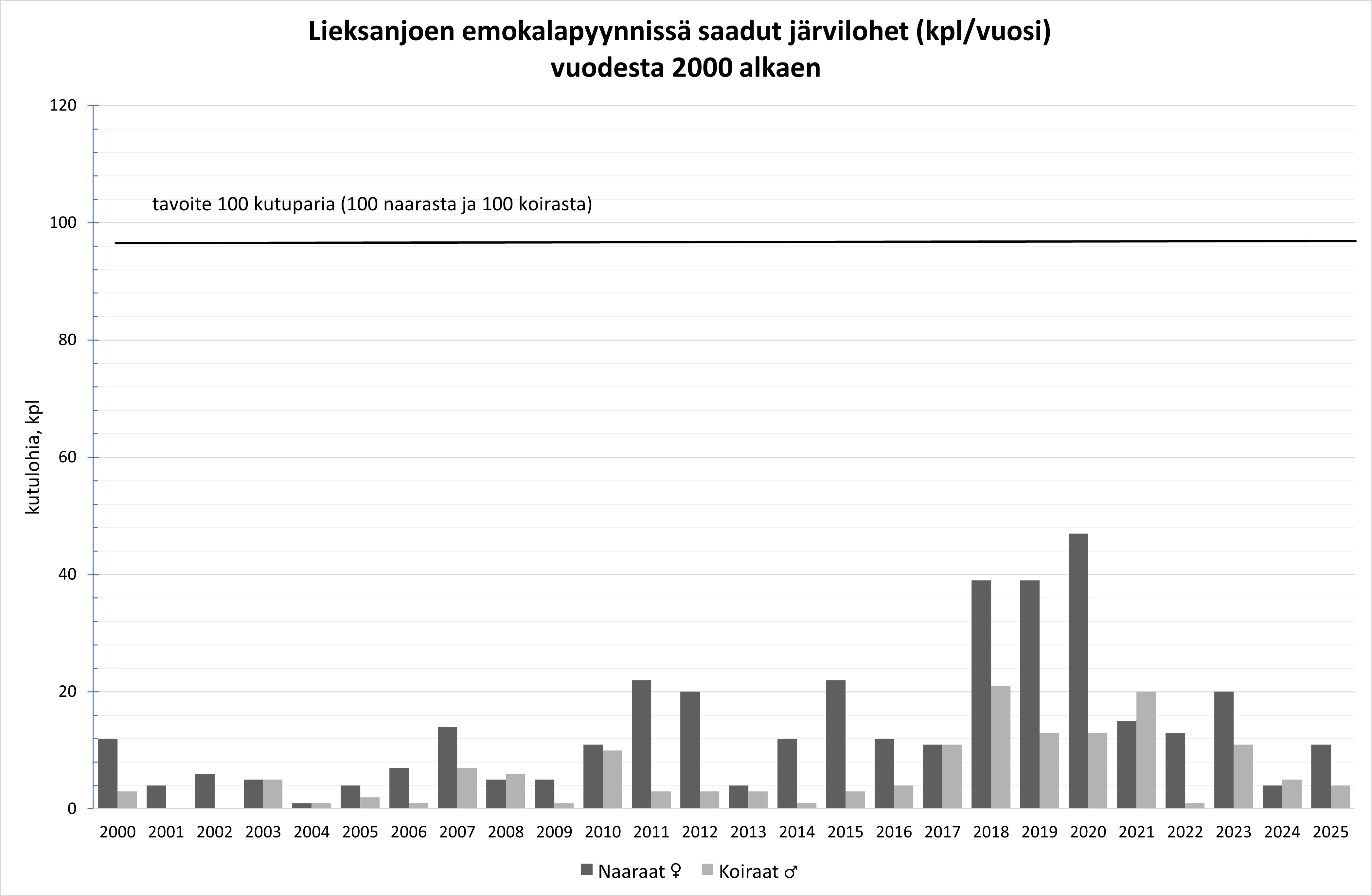 ▲ Lieksanjoen emokalapyynnissä saadut järvilohet 2000 - 2025 (kpl/vuosi)