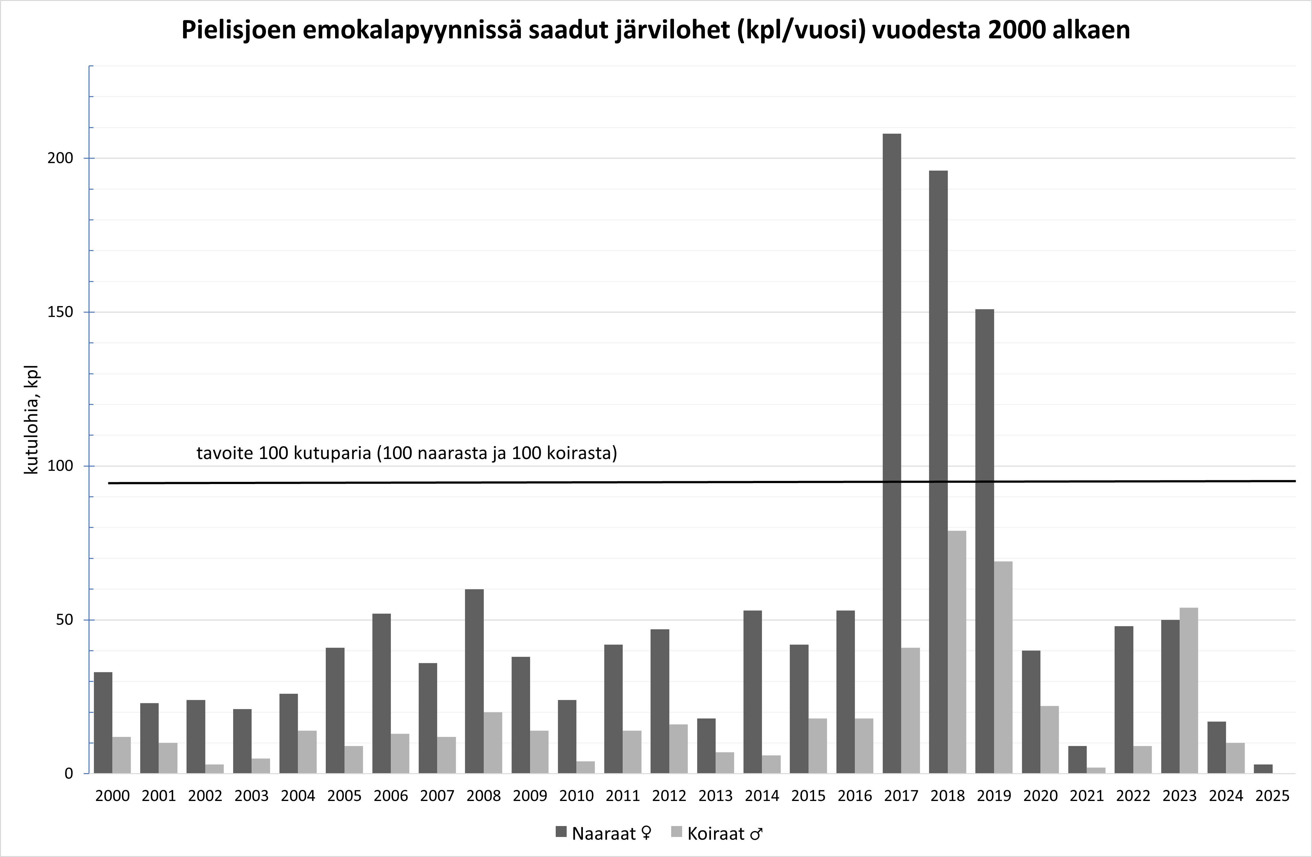 ▼ Pielisjoen emokalapyynnissä saadut järvilohet 2000 - 2025 (kpl/vuosi)
