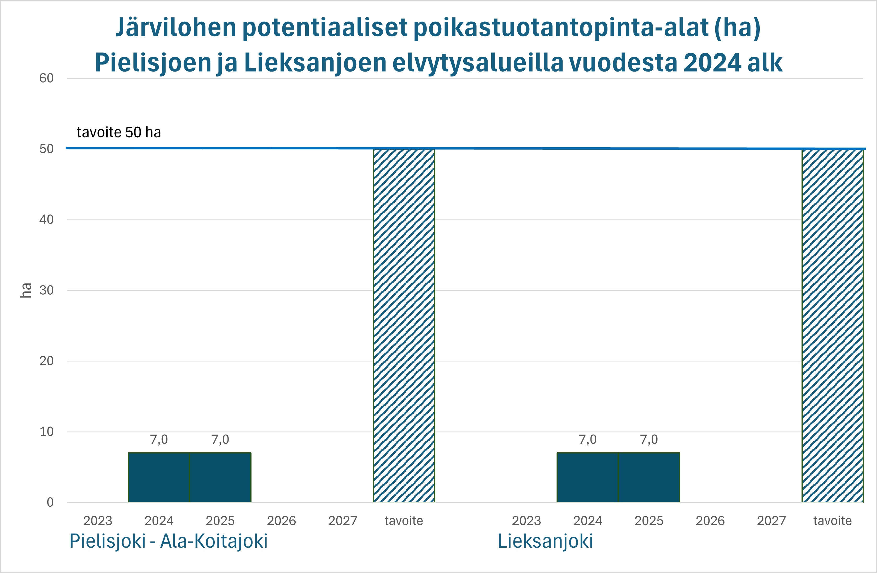 Järvilohen potentiaaliset poikastuotantopinta-alat (ha) Pielisjoen ja Lieksanjoen elvytysalueilla vuodesta 2024 alkaen