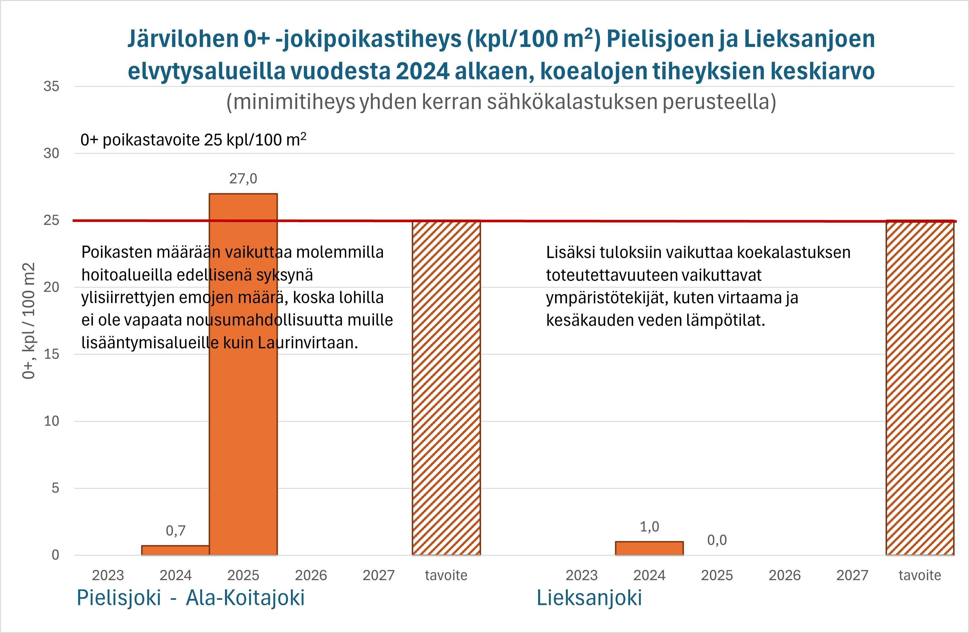 Järvilohen 0+ -jokipoikastiheys (kpl / 100 m2) Pielisjoen ja Lieksanjoen elvytysalueilla vuodesta 2024 alkaen, koealojen tiheyksien keskiarvo